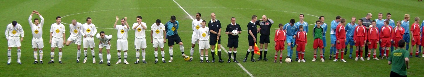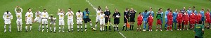 The teams line up, Leamington in white |