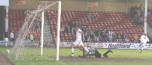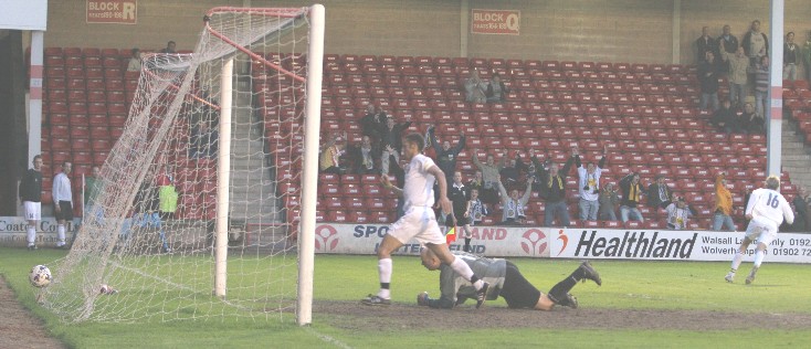 the ball into the goal and Alex Rodman turns away.